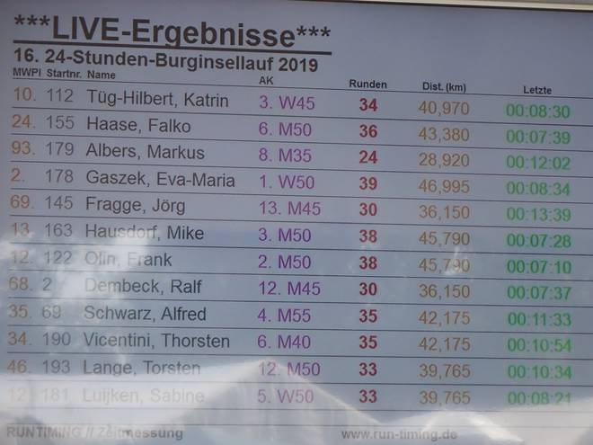 Runde 39 (46,995 Km) 17.15 Uhr Für meine Runden 37 und 38 benötigte ich 12:26 und 12:08 Minuten. Danach kam ich ein wenig schneller voran. |