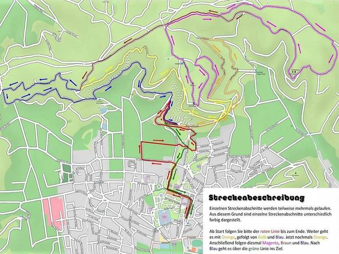 Spielbank Bad Pyrmont 9.57 Uhr Der Streckenplan des Bad Pyrmont-Marathons ist das reine Chaos. Die Strecke ist siebenfarbig. Man läuft sie in der Reihenfolge Rot, Orange, Gelb, Blau, Orange, Magenta, Braun, Blau, Grün. Gelb und Orange laufen teilweise im Gegenverkehr, Rot und Blau teilweise parallel. 2011 habe ich zwei Wochen vergeblich versucht, mir das Chaos einzuprägen. |