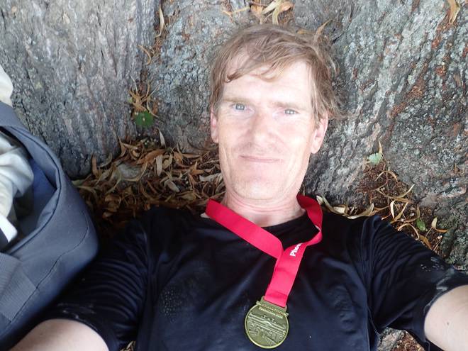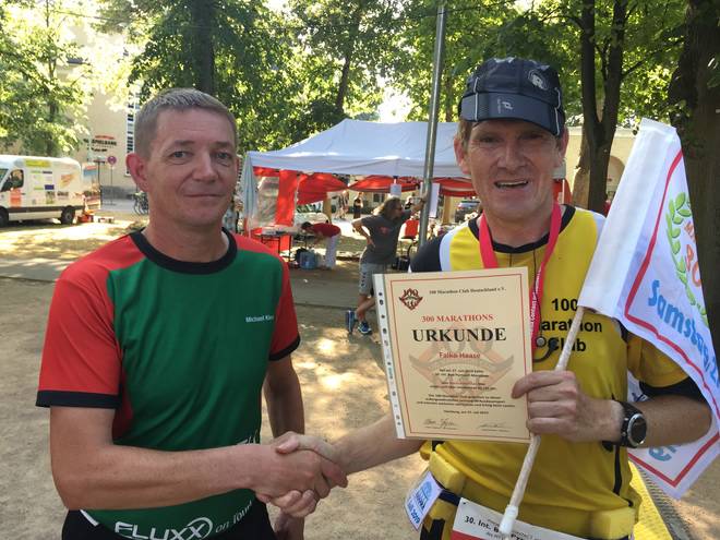 Hauptallee 17.56 Uhr / Km 42,195 Und dann war es geschafft. Mein 300. Marathon-Finish gekrönt mit meiner Marathon-Medaille Nr. 300. (Foto: Michael Kiene) |