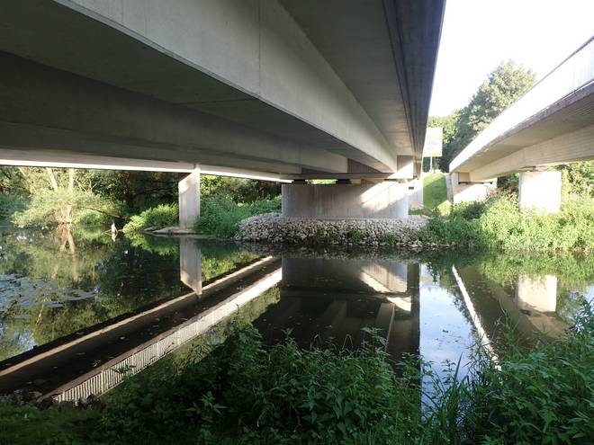 Emmer Bahnhofstraße 19.13 Uhr Mit zwei Pausen auf Bänken und über einem Liter trinken hatte ich es bis unter diese Brücke geschafft. |