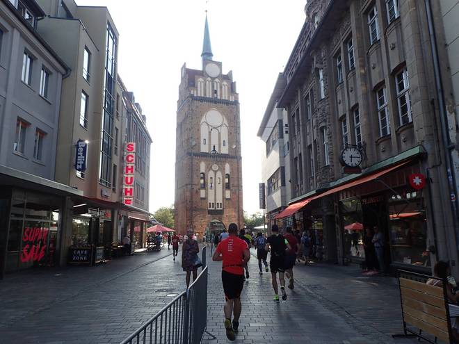Kröpeliner Tor 18.34 Uhr / Km 4,0 Ein sehr interessantes Foto. Was man nicht alles über sich selbst lernen kann, nur wenn man fotografierend läuft (oder laufend fotografiert). Vor Ort achtete ich nur auf den Turm und daß die Läufer dazu paßten. |
