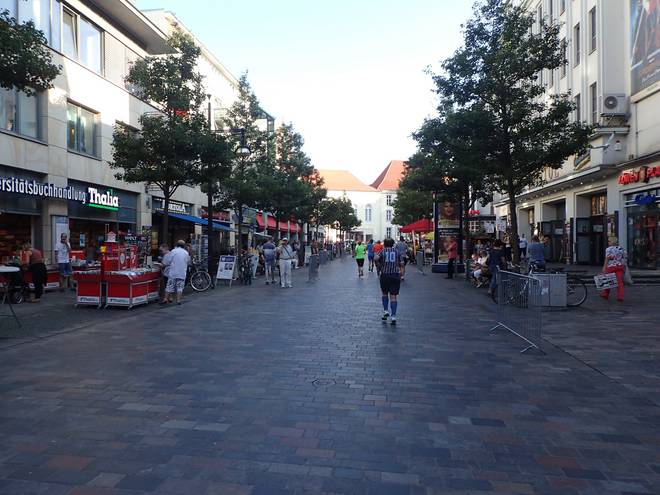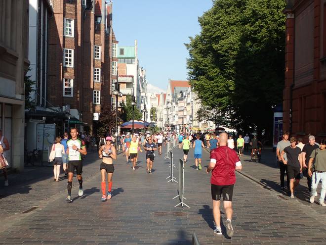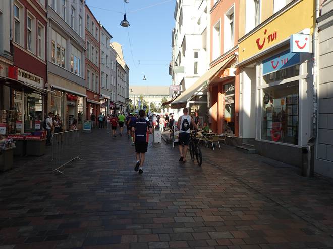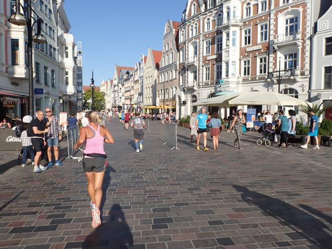 Kröpeliner Straße 18.25 Uhr / Km 2,5 Es ging die Fußgängerzone in ganzer Länger durch, teils mit Gegenverkehr. |