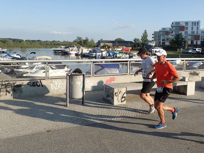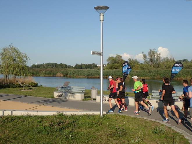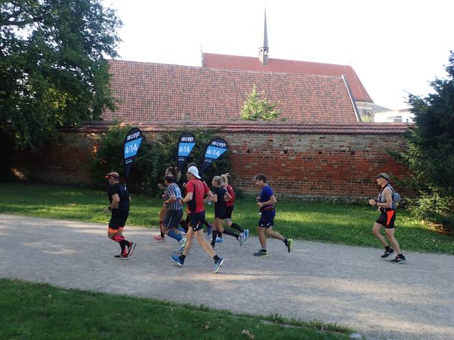 Gerbergrabenweg An der Warnow 18.58 Uhr / Km 8,0 Von den 4:14-Stunden-Läufern konnte ich mich nicht lösen. Anfangs hatte ich sie im Rücken gehabt, nun lief ich hinterher. |