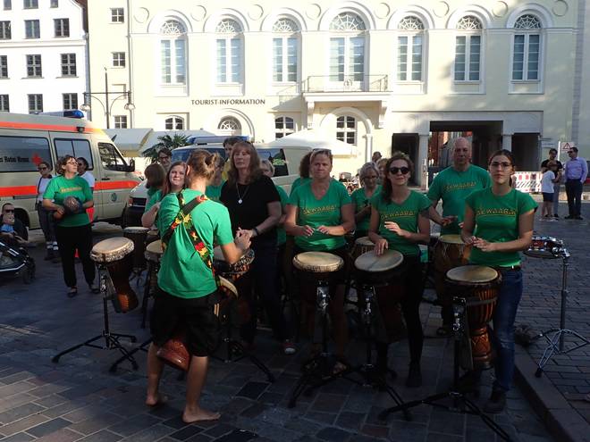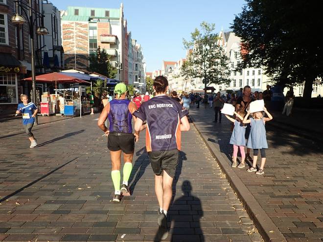 Kröpeliner Straße 18.45 Uhr / Km 5,8 In der Fußgängerzone waren nach dem Neuen Markt noch die meisten Zuschauer an der Strecke. Und Musik gab es auch. |