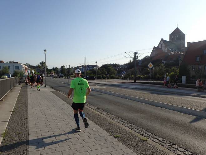 Warnowstraße 18.55 Uhr / Km 7,6 Hier war ich 2012 auch nicht entlang gelaufen. Ein wenig hatte sich die Strecke schon geändert. Nicht zum Nachteil wie ich fand. Rechts oben die Nikolaikirche. |