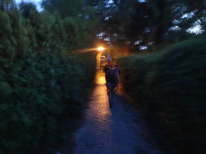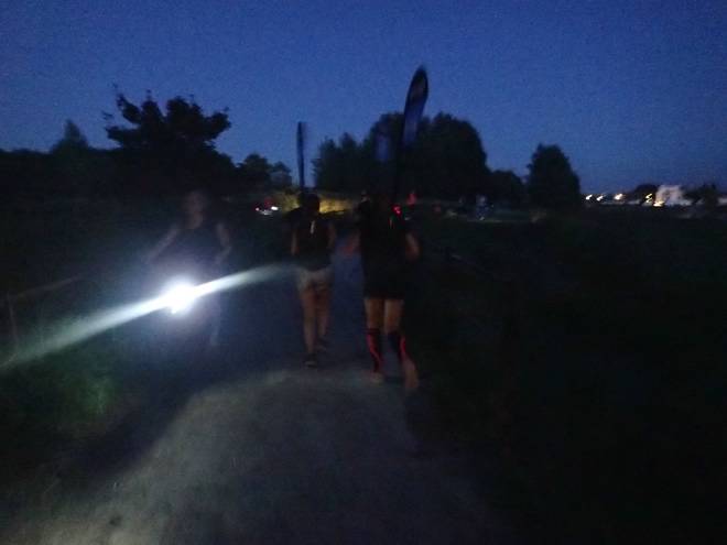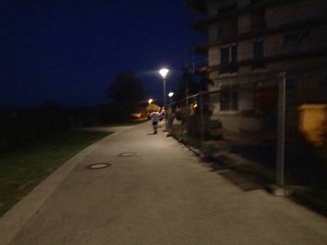 Unterwarnow 21.57 Uhr / Km 37,8 Ausgeleuchtet wurde der Weg durch einige Radfahrer. Also praktischerweise lief man zu mehreren nebeneinander, versperrte so dem Radfahrer hinter einem den Fahrweg und hatte schön Licht. |