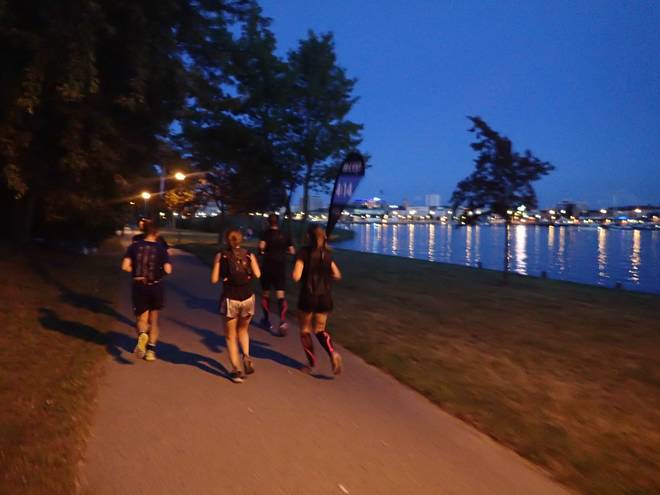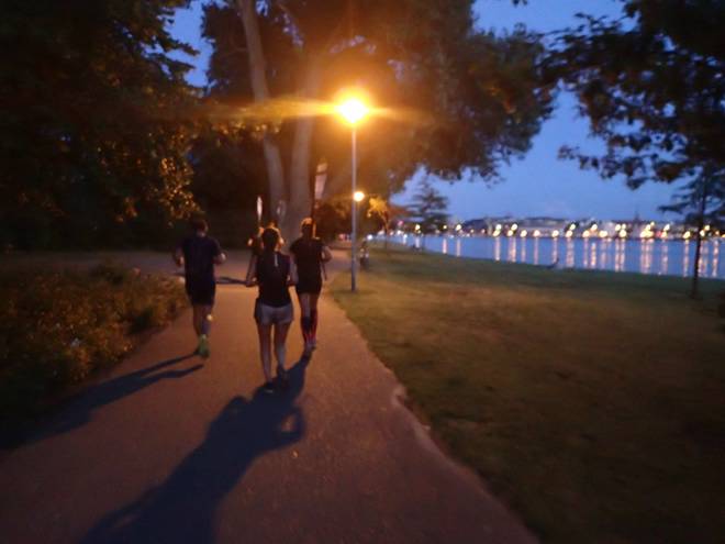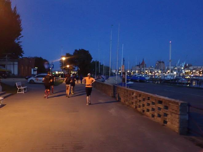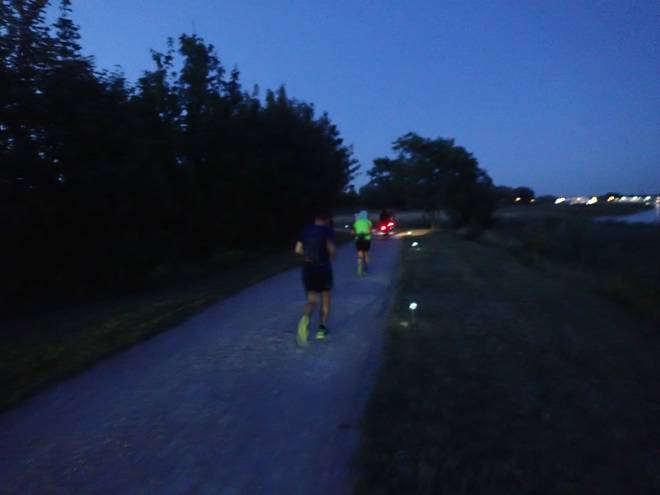Unterwarnow 21.45 Uhr / Km 35,7 Eigentlich war Gruppe etwas übertrieben. Es waren noch die drei offiziellen Zeitläufer und ein Mitläufer. |