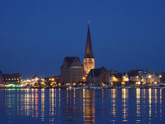 An der Warnow 22.09 Uhr / Km 39,8 Die Petrikirche voraus ging es weiter. 2007 machten wir noch eine Runde durch den Hafen, 2012 zumindest noch einen Abstecher. |
