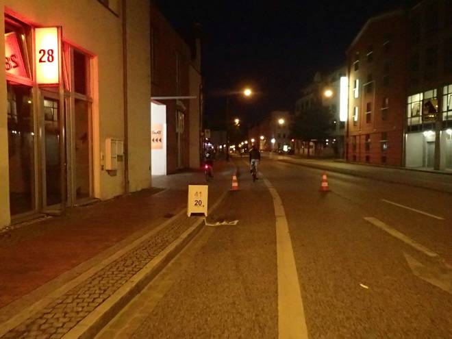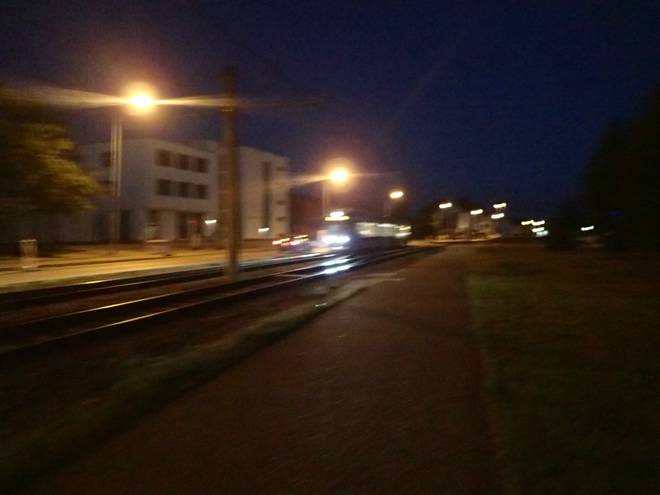 Unterwarnow 21.52 Uhr / Km 36,9 Der sonst nicht beleuchtete Strecken-Teil war mittels kleiner Leuchten markiert. Sehen konnte dadurch nichts, aber verlaufen auch nicht. |