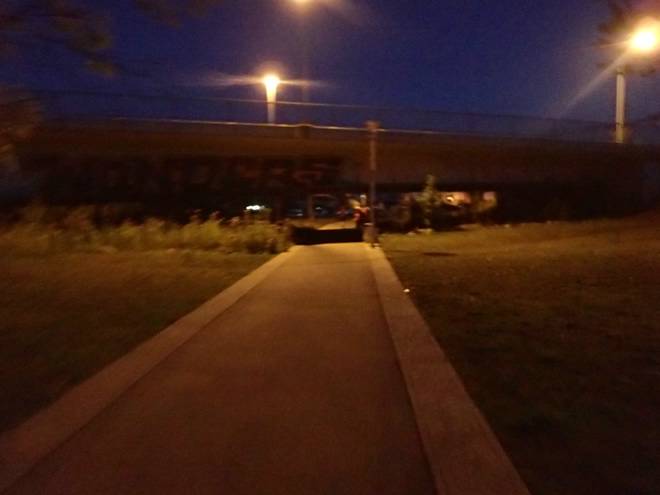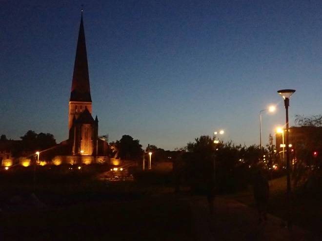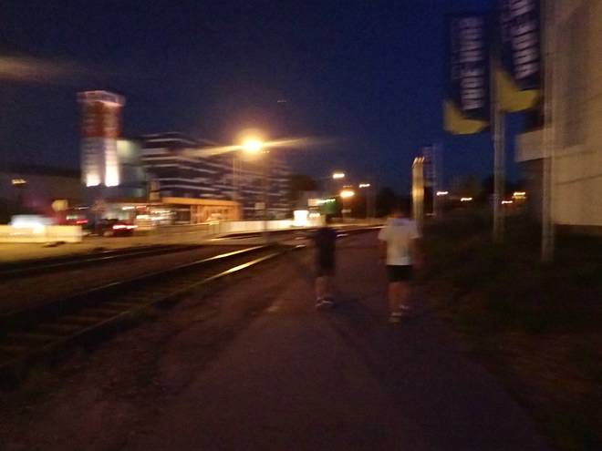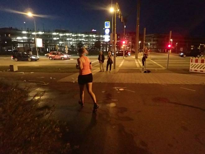 Dierkower Damm 22.04 Uhr / Km 39,0 Rostocks Innenstadt kam nun näher. Oder genau gesagt: ich der Innenstadt. Die 4:14-Stunden-Gruppe ließ ich bei Kilometer 38 zurück. Im dritten Anlauf war ich ihnen entkommen. Auf dem dunklen und schmalen Weg an der Unterwarnow war das nicht so einfach. |