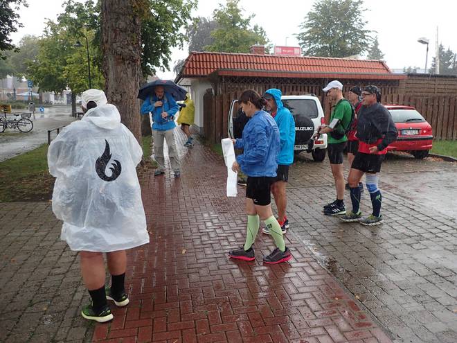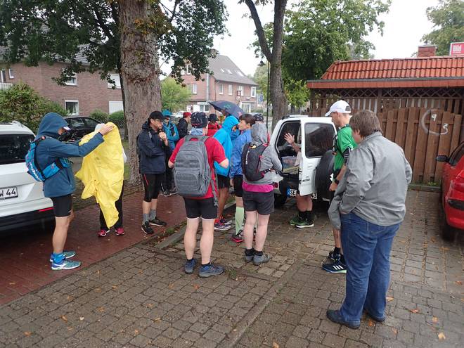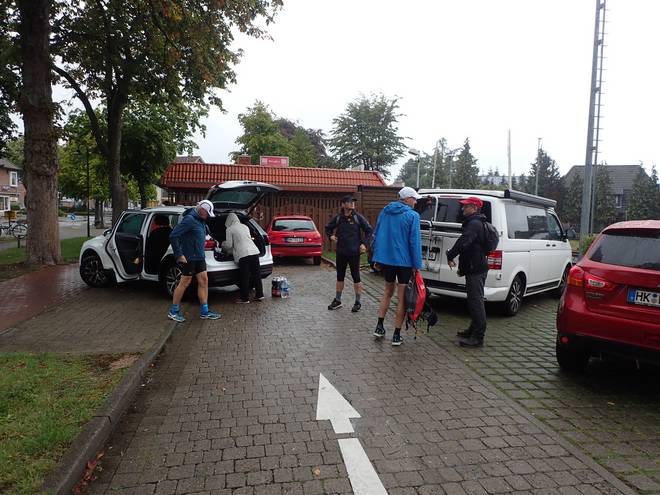 Schneverdingen Am Bahnhof 10.13 Uhr Die Unterlagen-Ausgabe und ein kurzes Briefing dann im strömenden Regen. Spannend die Frage: wie kriege ich den Kontrollzettel trocken über die Strecke? Ich hatte zwar einen Plastikbeutel dabei, aber der Zettel war schon naß, bevor er im Beutel war. Die nächsten 41 Kilometer würde ich ihn aber nicht brauchen. Trocknet der Zettel in einem geschlossenen Plastikbeutel? Oder werden die anderen Sachen auch naß? |