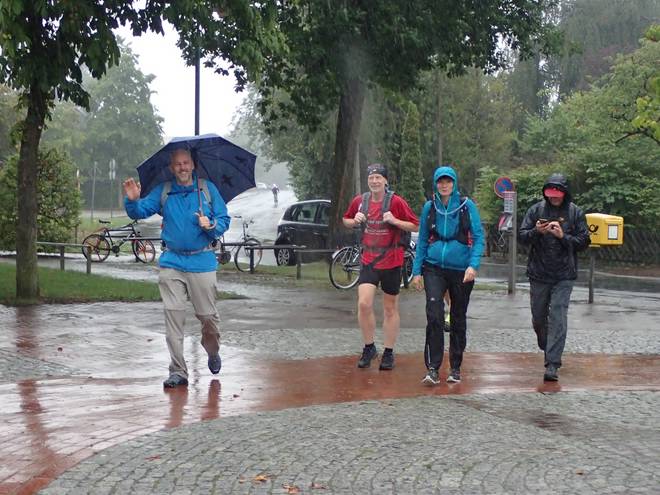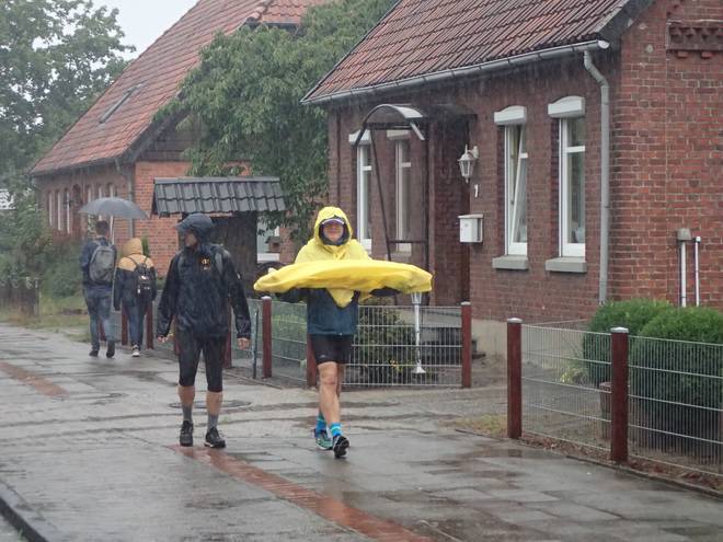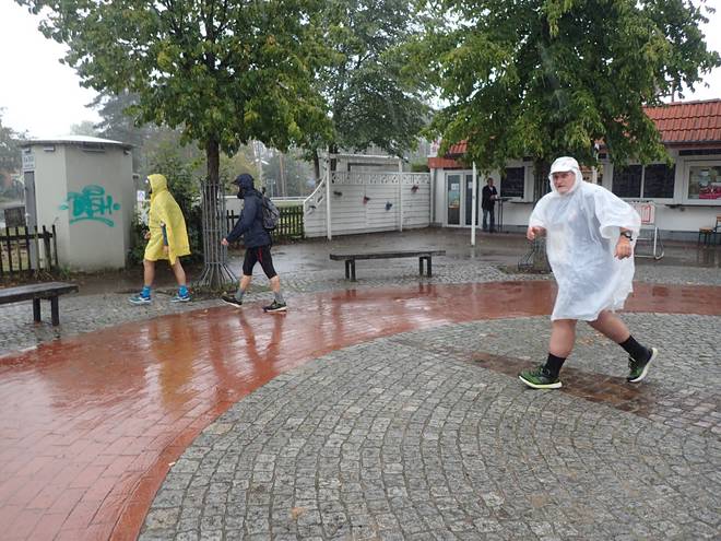 Schneverdingen Schröderstraße 10.19 Uhr / Km 0,05 Es gab verschiedene Ansätze, dem Regen zu trotzen. Oder eben auch nicht. |