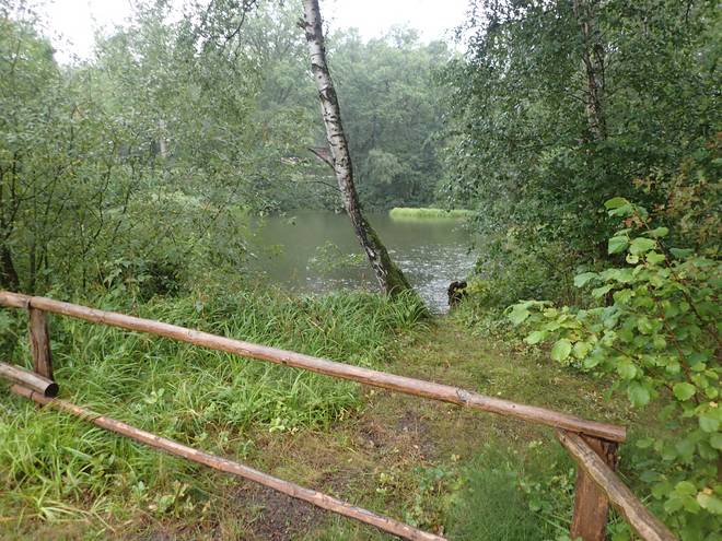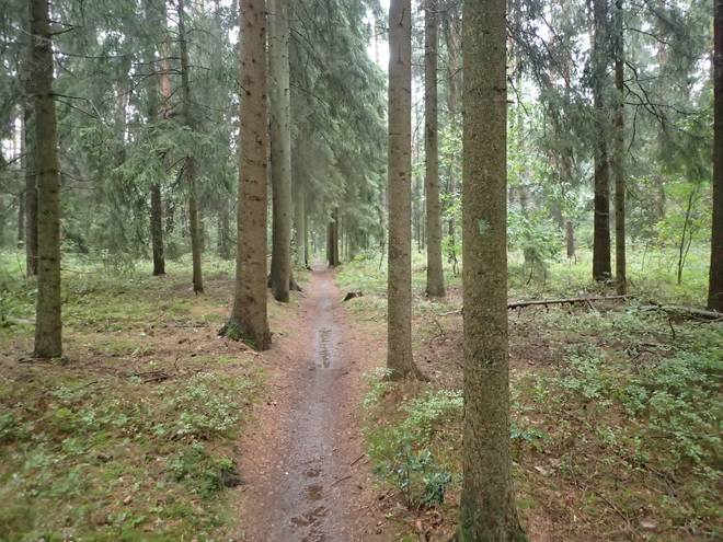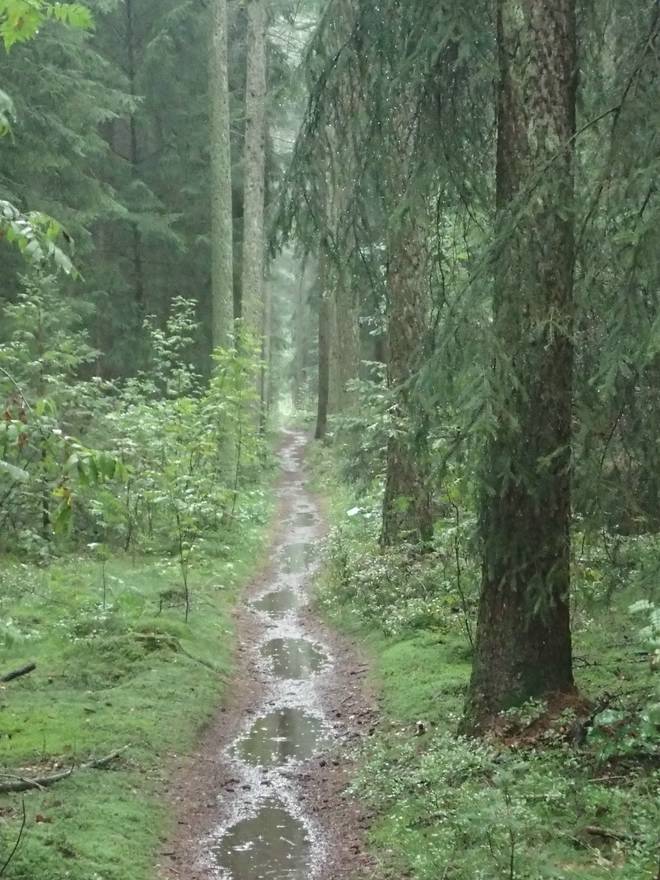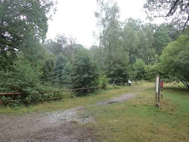 Spitzbubenweg 11.01 Uhr / Km 6,4 Eine Weile versuchte ich, die Pfützen rechts oder links zu umlaufen, aber das Gras war auch naß und da sammelte ich ähnlich viel Wasser auf, als wenn ich einfach in den Pfütze trat. |