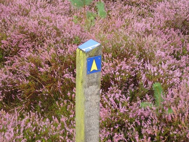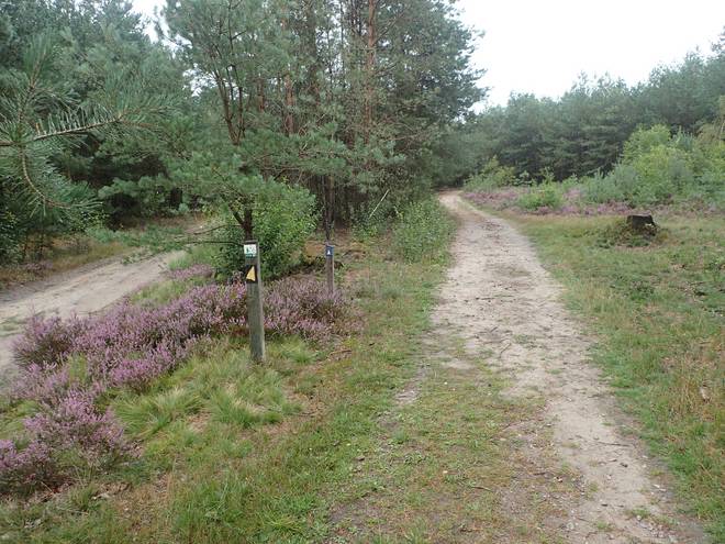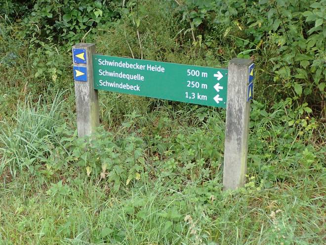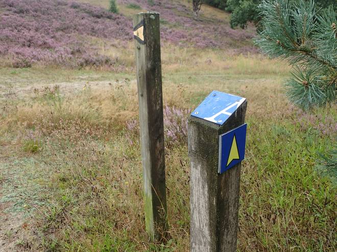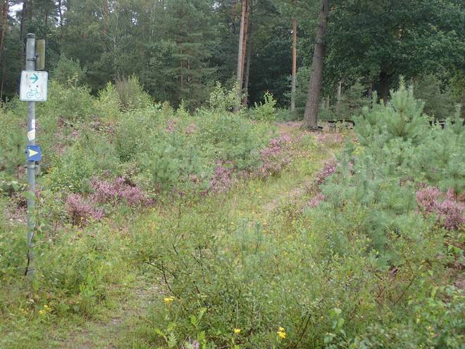 Schwindebecker Heide 13.39 Uhr / Km 28,8 Ich traf nun auf dem Heide-Panorama-Weg (blau-gelbe Pfeile), den ich vom Heide-Diplom-Ultramarathon schon zweifach kannte. |
