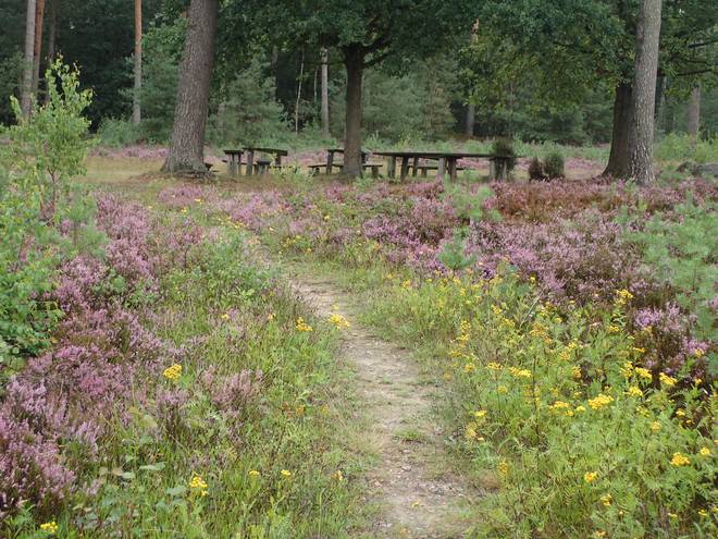 Schwindebecker Heide 13.39 Uhr / Km 28,7 Und hier durfte man sogar ein kurzes Stück durch die Heide laufen. So zeigte es jedenfalls der Weg an. Ich wanderte ganz langsam und vorsichtig durch. Man kann ja auch zwischen die Pflanzen treten, auch wenn es nicht so aussieht, als gäbe es da ein "dazwischen". |