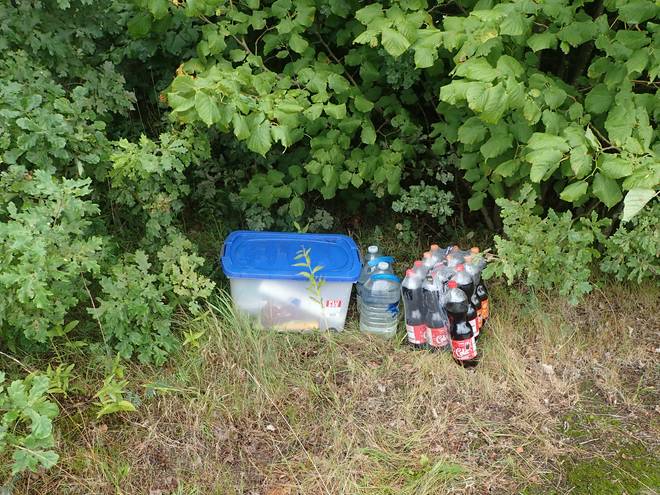 Schwindebeck 14.09 Uhr / Km 32,0 Schließlich erreichte ich den Verpflegungsstand. Der war unbemannt. Trinken, die eigene Flasche nachfüllen, schnell mal ins Gebüsch... |