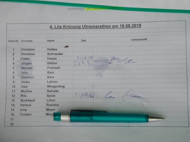 Schwindebeck 14.13 Uhr / Km 32,0 ... und die Kontroll-Liste nicht vergessen. Zum Führungsduo hatte ich 54 Minuten Rückstand und bei meinem aktuellen Tempo war es unwahrscheinlich, daß ich eingeholt wurde. Das war ein sehr sicherer dritter Platz. |
