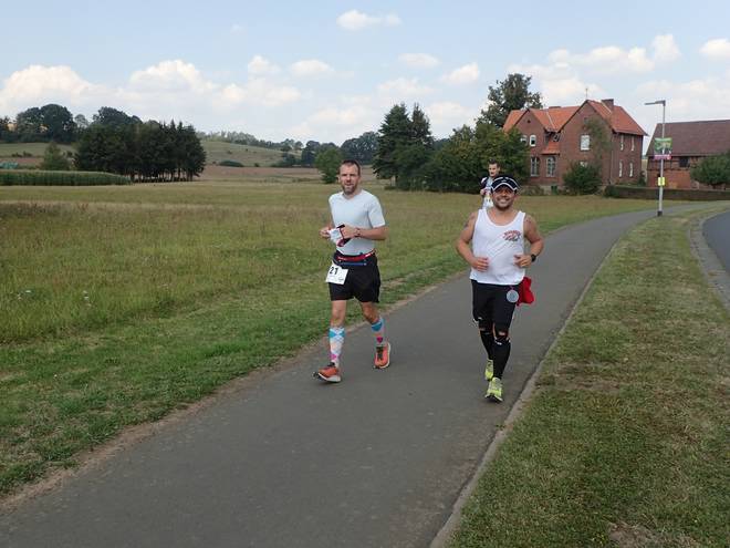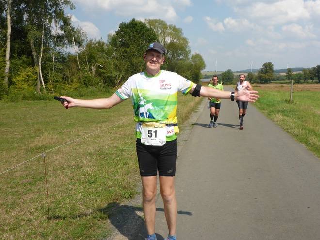 Rauschenberg Siedlungstraße 14.11 Uhr / Km 41,8 Ein Marathon, wie ich ihn so noch nicht erlebt hatte. Erst meine Anmeldung nur wegen des Finisher-Shirts, dann die schwierige Anreise, ich krank, die Hitze und vor Ort allerlei Seltsamkeiten. Scheinbar eine freie Wahl von Startzeit und Strecke, keine Kontrollen unterwegs, wobei trotzdem alles funktioniert. Immer nur schön die Ruhe bewahren. |