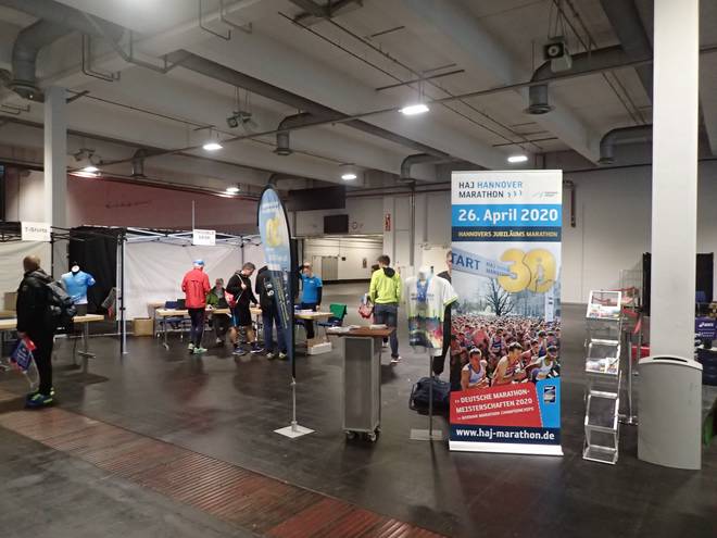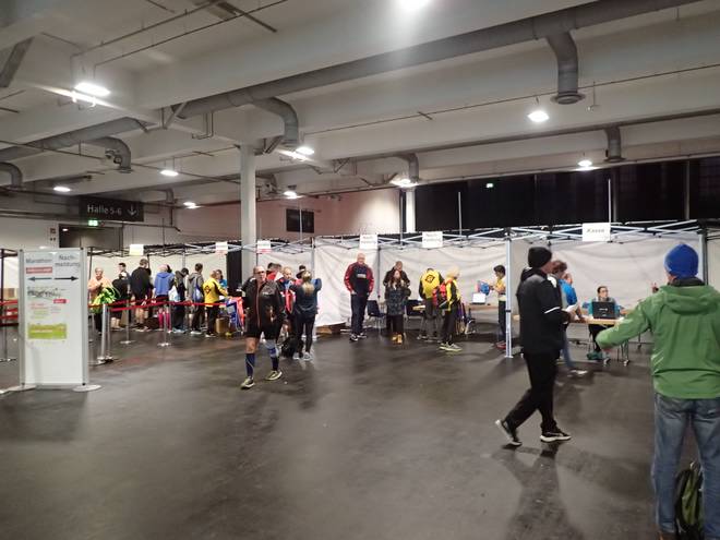 Messe Bremen Halle 4 8.23 Uhr Gleich nach der Ankunft in Bremen holte ich mir meine Startunterlagen ab. Etwas unpraktisch, daß die Startunterlagen-Ausgabe vom Hauptbahnhof aus auf der gegenüber liegenden Seite des Startgeländes war. Also erst 750 Meter zur einen und dann noch 850 Meter in die andere Richtung, |