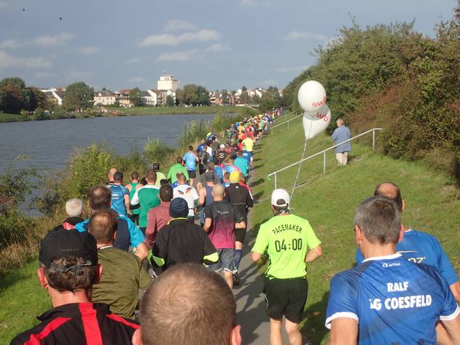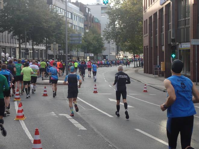 Tiefer Altenwall 9.40 Uhr / Km 1,5 Ich kam ganz gut hinein in den Lauf. Aber die 4:00-Stunden-Ballons waren mir schon davon gezogen. |