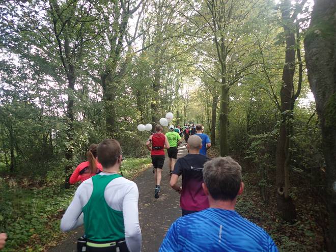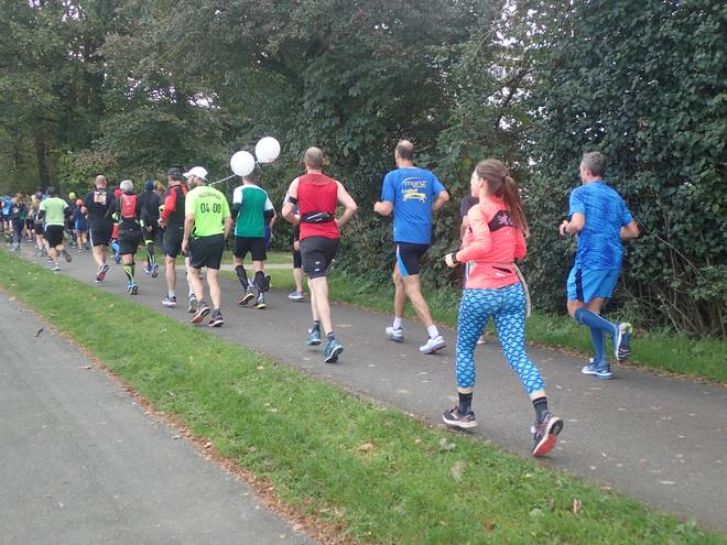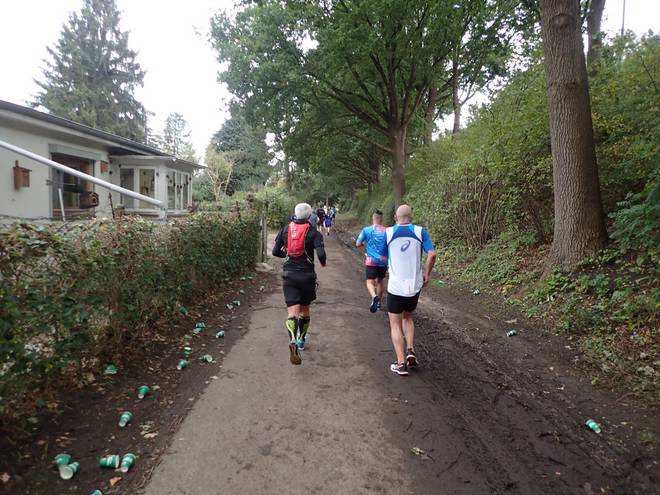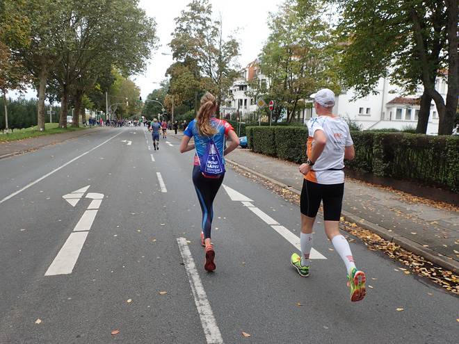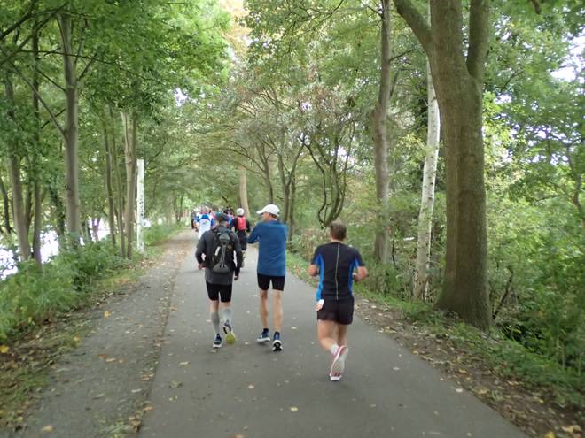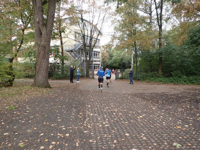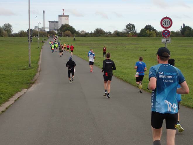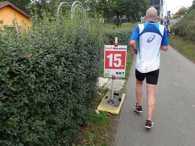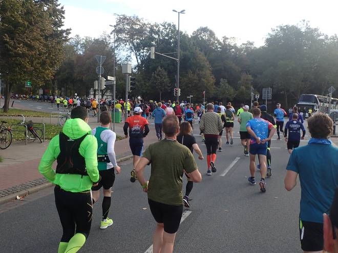 Holzdamm 10.27 Uhr / Km 10,0 27:45 Minuten für die zweiten fünf Kilometer. Drei Sekunden schneller als die ersten fünf Kilometer. Vor mir noch der zweite der beiden 4:00-Stunden-Läufer. |