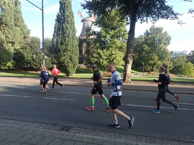 Kaffeemühle (Mühle am Wall) 9.00 Uhr Das Wetter war traumhaft. Blauer Himmel, Sonne., 7°C zum Start, später bis 12°C. Perfekt für einen Marathon. |