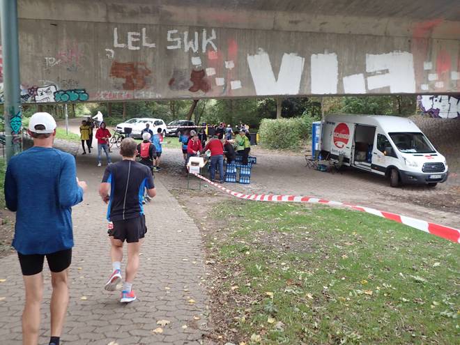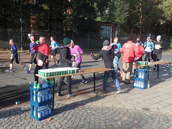 Holzdamm 10.27 Uhr / Km 10,1 Der zweite Verpflegungsstand. Hier hielten sich die Ballon-Läufer wieder überraschend lange auf. |