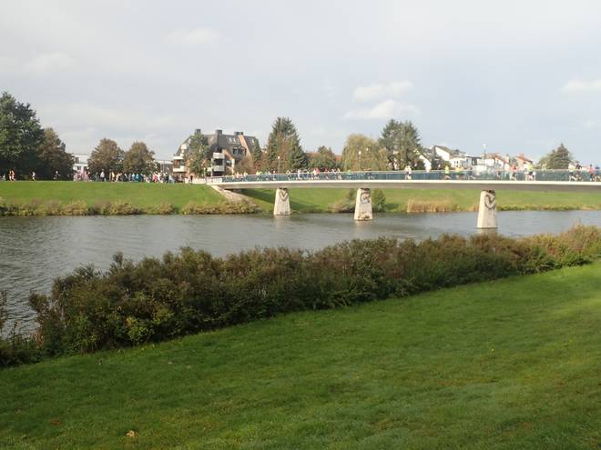 Weserwehr 10.45 Uhr / Km 13,3 Nun über das Weserwehr. Das bringt ein paar Höhenmeter in die Statistik. Von ein paar so kurzen, knackigen Anstiegen abgesehen ist der Kurs flach. |