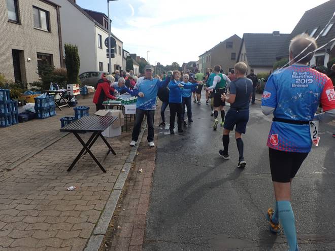 Werderstraße 10.00 Uhr / Km 5,2 Der erste von insgesamt neun Verpflegungsständen. Wobei der am Weserstadion nie im Streckenplan auftaucht. Also sind es offiziell wohl nur acht. |