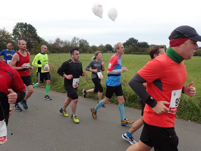 Am Werdersee 10.19 Uhr / Km 8,5 Ein erster Versuch, am Ballon-Läufer vorbei zu kommen, scheiterte aber. Der war doch zu schnell. |