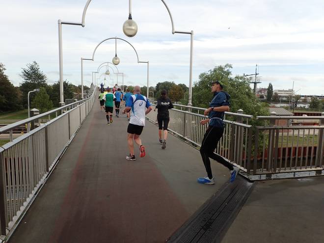 Wilhelm-Kaisen-Brücke 9.56 Uhr / Km 4,4 Nun ging es über die Kleine Weser. Ich war mehr mit Fotos als mit Laufen beschäftigt. |