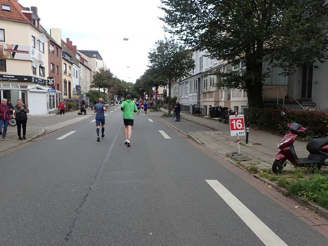 Stader Straße 11.00 Uhr / Km 16,0 Ich fing schon an zu überlegen, ob ich nicht neben der Vier-Stunden-Marke nicht auch die Zeit des Hamburg-Marathons 2019 würde knacken können. Die lag bei 3:56:54 Stunden. |
