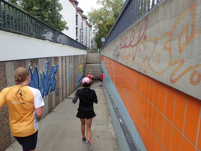 Staustraße 10.36 Uhr / Km 11,7 Dann die Premiere im fünften Anlauf. Meine Kollegin, die hier oft auf mich wartete, und ich fanden uns tatsächlich. Bisher hatten wir uns entweder übersehen oder hatten uns zeitlich verpaßt. |