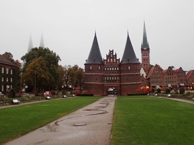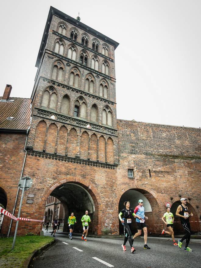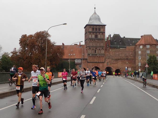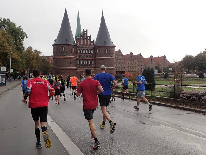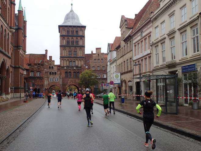 Holstenstraße 10.02 Uhr / Km 0,2 Lübecks Highlights liefen wir gleich zu Beginn ab: Das Holstentor. |