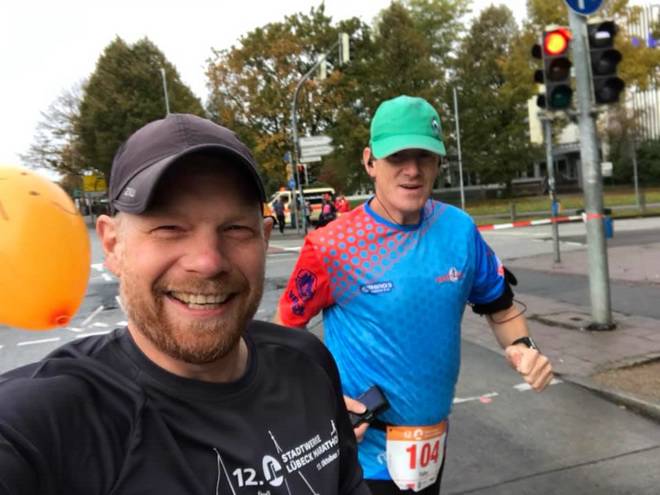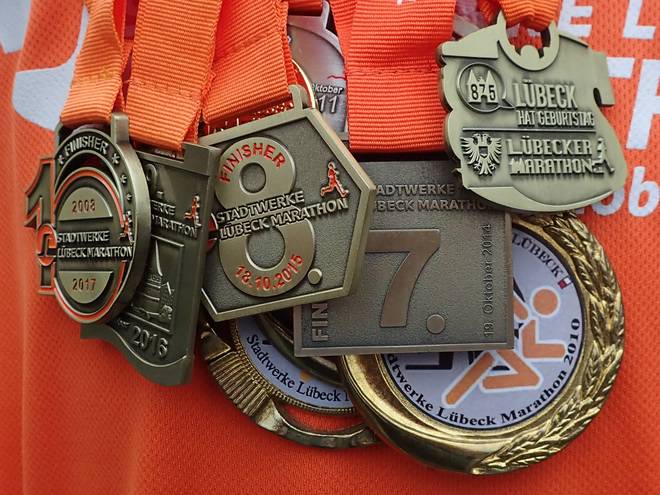 Wahmstraße 9.50 Uhr Ich war zum zweiten Mal in Lübeck dabei. Dieser Läufer hatte schon alle bisherigen elf Marathons gefinisht. Ob es aber so sinnvoll ist, mit elf Medaillen um den Hals einen Marathon zu laufen? |
