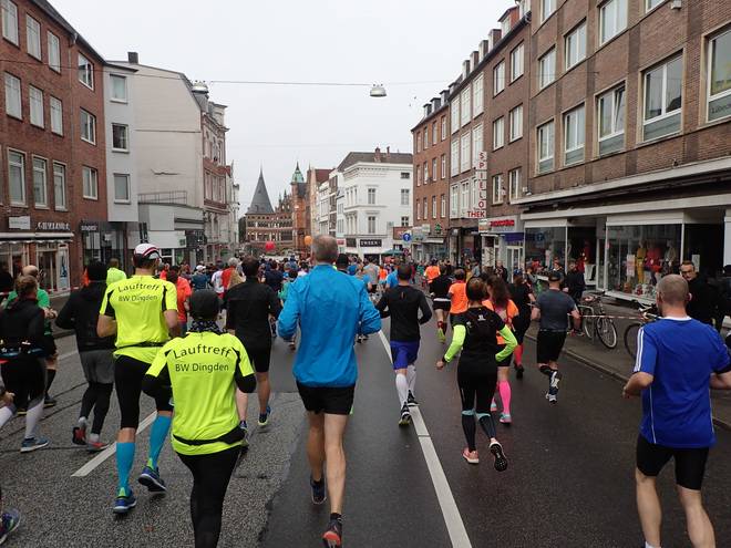 Holstenstraße 10.02 Uhr / Km 0,2 Mit 1:59:40 Stunden rechnete ich nicht. Ich war am Vortag schon in Öjendorf 4:27:46 Stunden gelaufen, kalkulierte für Lübeck eine ähnliche Zeit. |