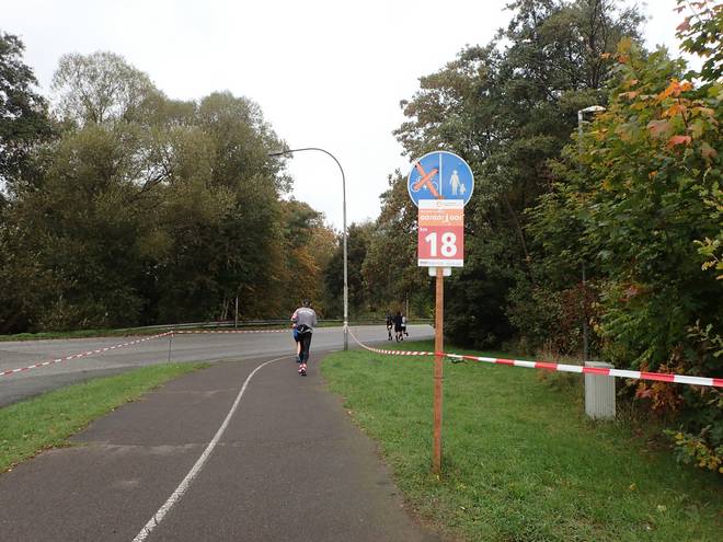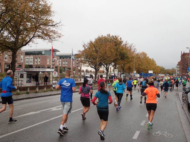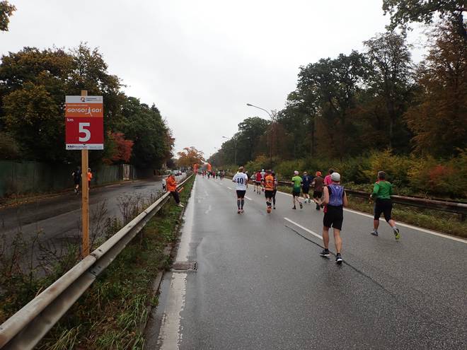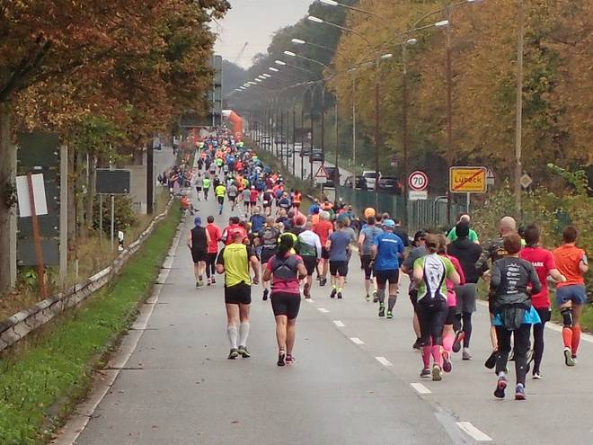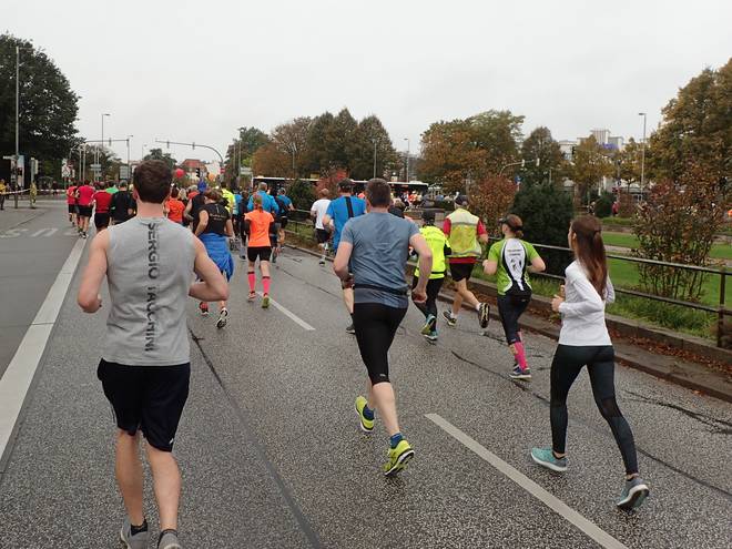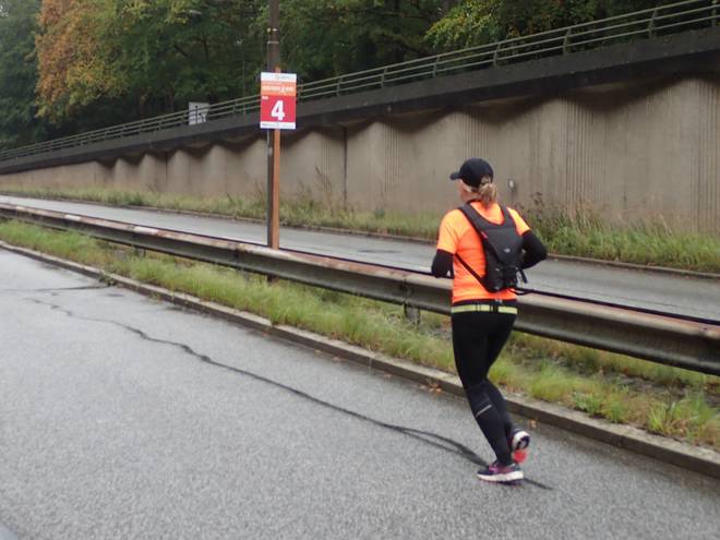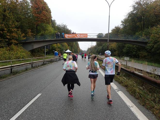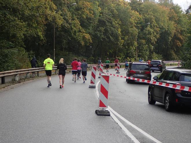Travemünder Allee / B 75 10.31 Uhr / Km 5,0 30:15 Minuten für die ersten fünf Kilometer. Da war ich etwas schnell unterwegs. Ich wollte eigentlich vorsichtiger starten, aber die Beine waren trotz des Öjendorf-Marathons am Vortag okay. |