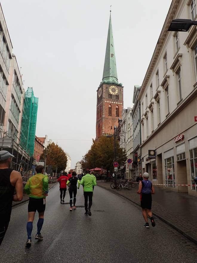 Breite Straße 10.11 Uhr / Km 1,7 Weiter ging es durch Lübecks Altstadt. Mit Blick auf den Turm der St. Jakobi Kirche startete dann das Pendelstück nach Travemünde. |