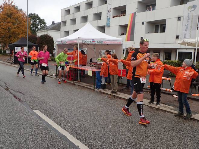 Travemünder Allee 10.22 Uhr / Km 3,5 Der erste Verpflegungsstand. Insgesamt waren es neun. Je Richtung. Machte insgesamt also 18. Und Coca-Cola gab es schon hier. |