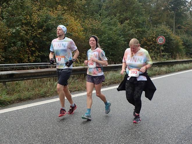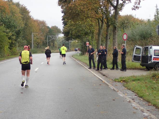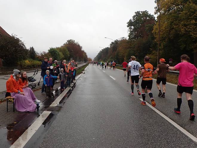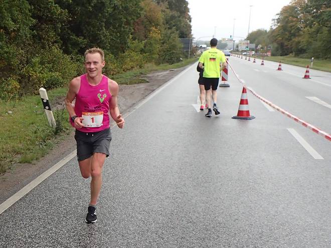 Travemünder Landstraße 11.38 Uhr / Km 15,4 Hier kam mit Jan Kaschura entgegen. Er war schon bei Kilometer 27,9 und gewann später den Marathon nach nur 2:28:37 Stunden. Mit 13:18 Minuten Vorsprung. |