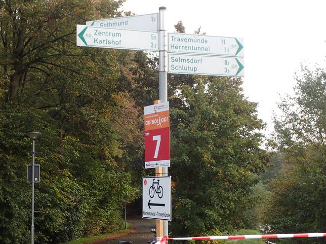 Km 6,8 Wir waren nun runter von der Travemünder Allee. Aber nur um eben mal die Straßenseite zu wechseln. |