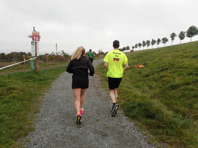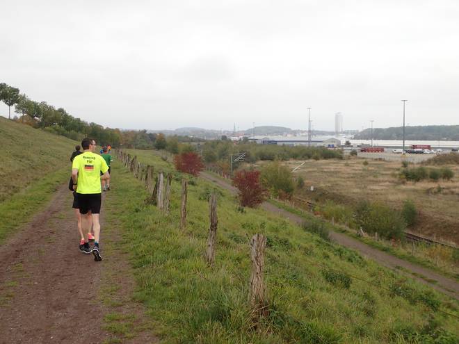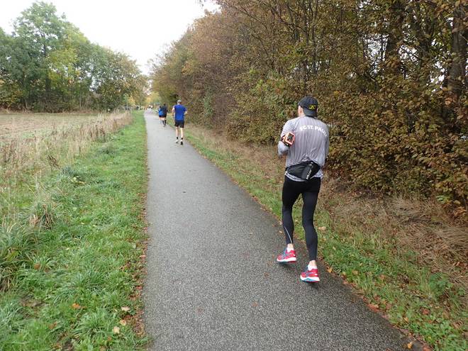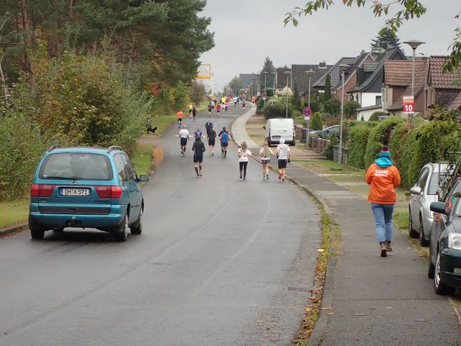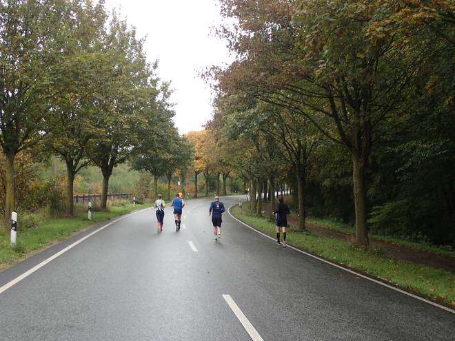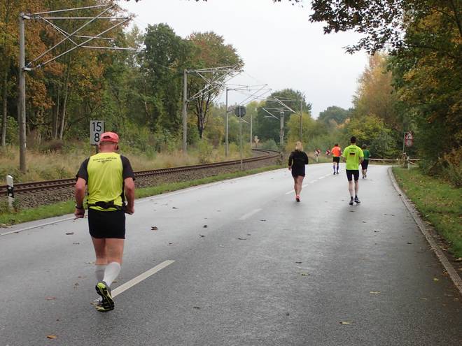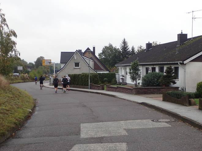 Beckergrube 10.10 Uhr / Km 1,5 Die Streckenteilung war für meine Gruppe egal, aber die Schnupperläufe waren kurz nach uns um 10.05 Uhr auf die Strecke gegangen und uns auf den Fersen. |