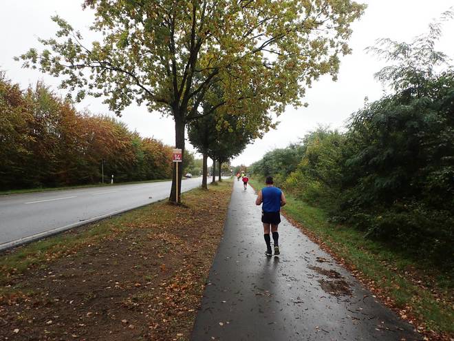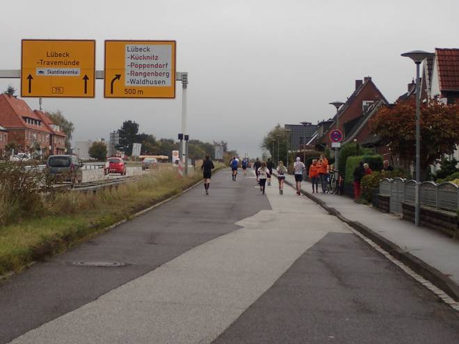 Travemünder Landstraße 11.29 Uhr / Km 14,0 Immer weiter ging es recht unspektakulär nach Norden. Und das alles mußte man auch wieder zurück laufen. |
