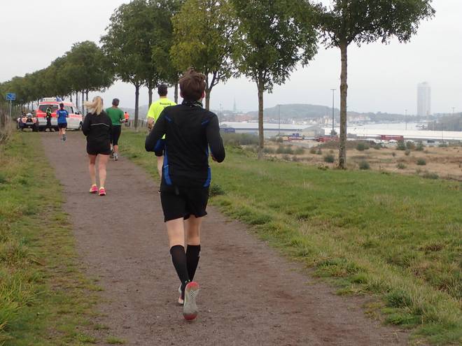 Auf dem Baggersand 11.58 Uhr / Km 18,7 Nun kamen mit immer mehr Läufer entgegen, die bereits wieder auf dem Weg zurück nach Lübeck waren. |