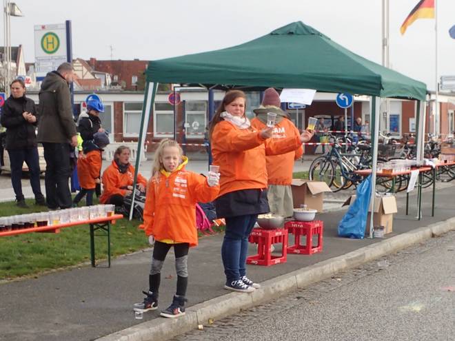 Fährvorplatz 12.00 Uhr / Km 19,0 An der Priwall-Fähre stand der achte Verpflegungsstand. Nun griff ich doch jedes Mal zu. |