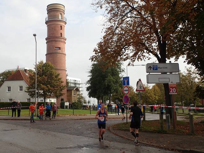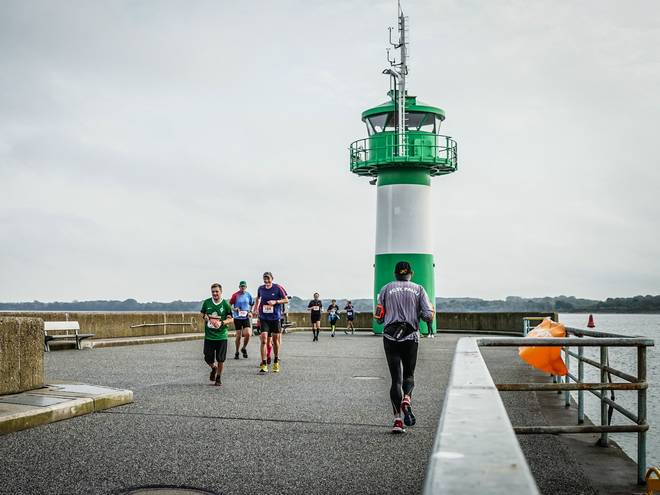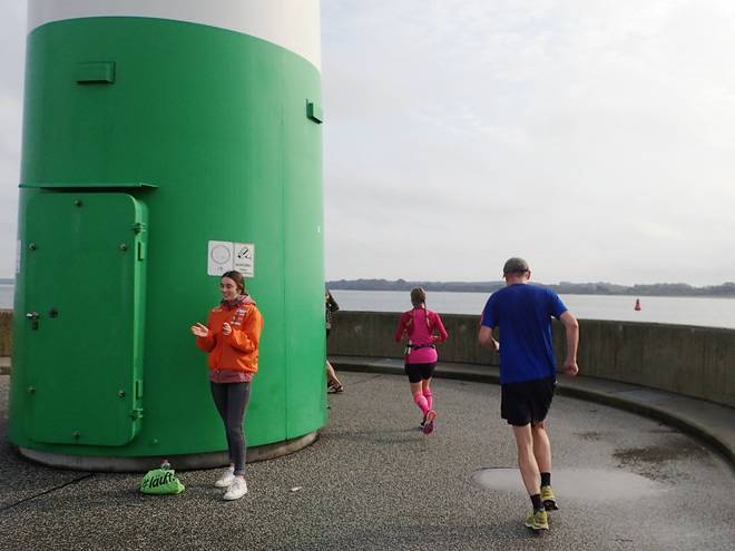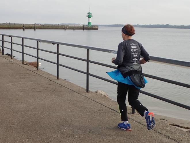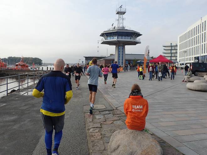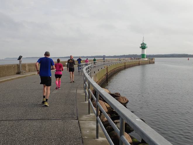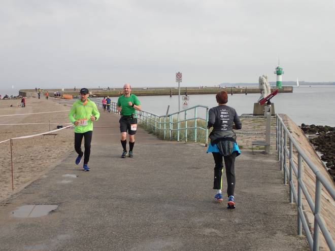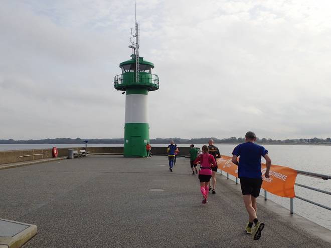 Nordermole 12.10 Uhr / Km 20,8 Den Fotografen hatte ich übersehen. Ich hatte ja nur Augen für den Leuchtturm. Immer auf der Suche nach einem eigenen Foto-Motiv rannte ich links entlang der Mauer und so am Fotograf vorbei. Foto: Sportograf