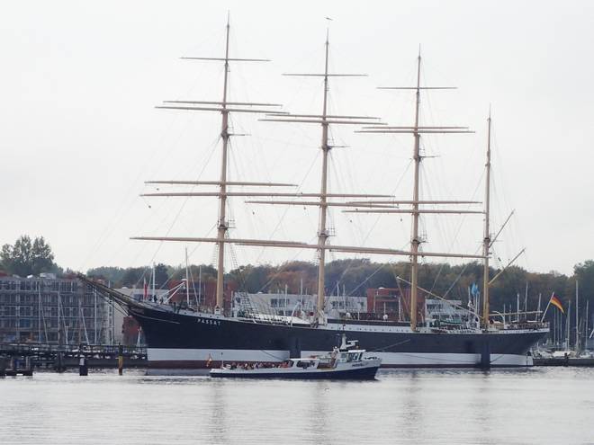 Nordermole 12.12 Uhr / Km 21,0 Über die Trave hinweg auf der Priwall-Seite konnte man die Viermastbark "Passat" sehen. |