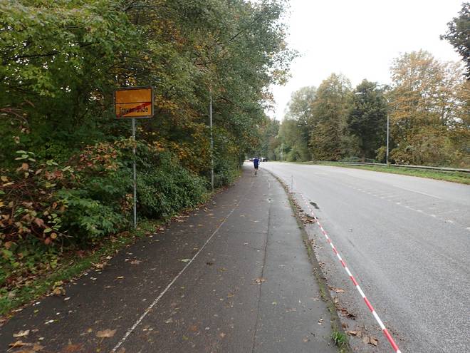 Travemünder Landstraße 12.56 Uhr / Km 28,0 Unweit von hier war mir um 11.38 Uhr der Führende entgegen gekommen. Ich war nur 78 Minuten langsamer. |