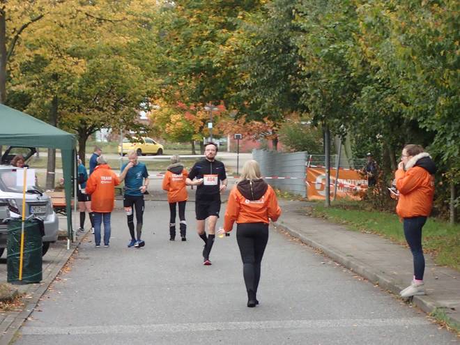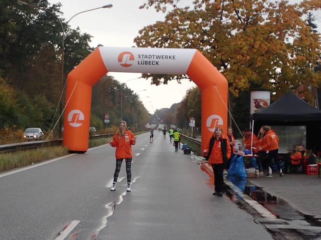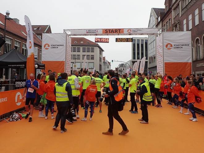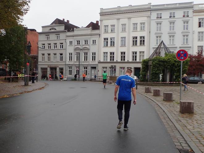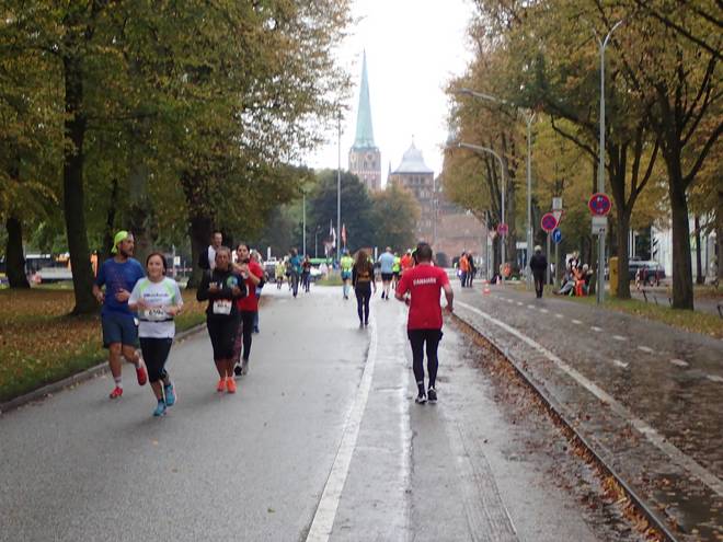 Gustav-Radbruch-Platz 14.11 Uhr / Km 40,6 Plötzlich gab es doch wieder Gegenverkehr. Ich lief in die 10x 4,2 Kilometer-Staffel rein. Es machten 116 Staffeln mit. Ob tatsächlich jede Staffel 10 Teilnehmer hatte ist sicher fraglich, aber das brachte sehr viele Läufer nach Lübeck. |