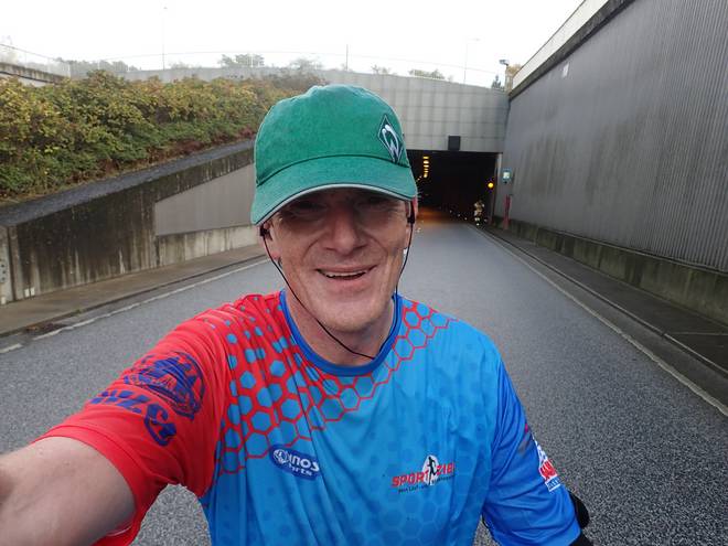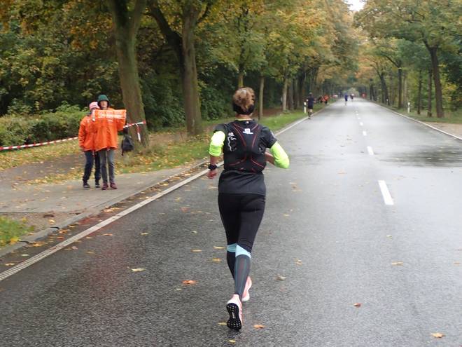 Travemünder Landstraße 13.12 Uhr / Km 30,6 Im Regen von Kücknitz überholte ich Madeleine. Am Anfang waren wir eine Weile zusammen gelaufen, dann zog sie mir davon und ausgerechnet in meiner eher langsamen Phase überholt ich sie zurück. Aber sie schaffte es natürlich auch ins Ziel. |